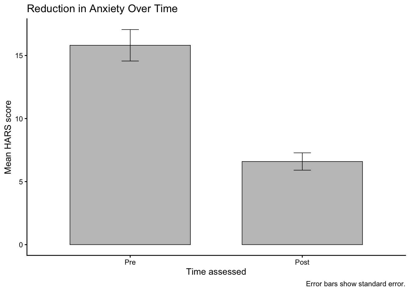 Research hypothesis: There is a difference between anxiety scores before and after treatment, \(\mu_{pre}\neq\mu_{post}\) and \(\mu_{difference}\neq0\)