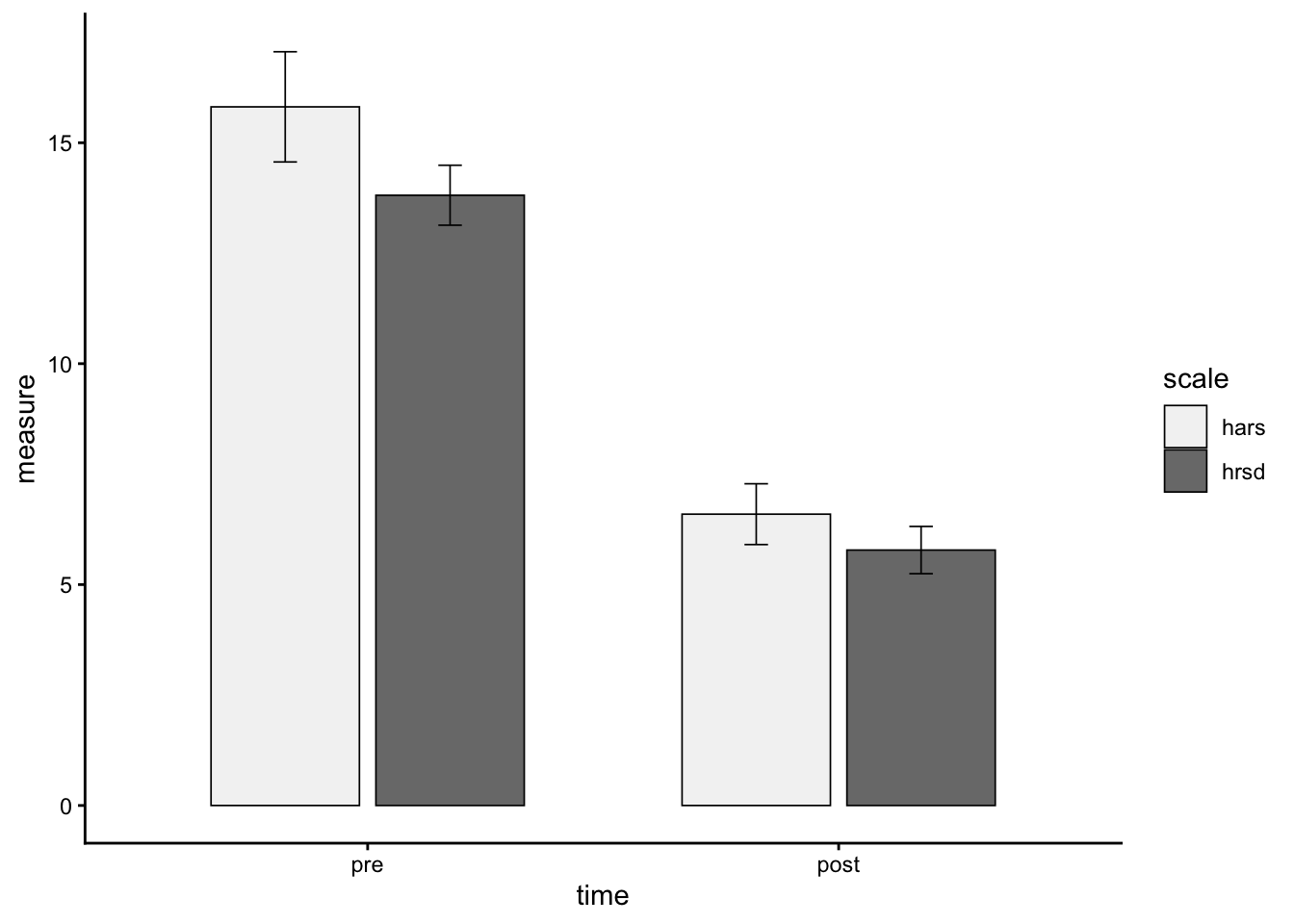 Now, in Jamovi, and under the paired samples t-test menu, click “Descriptives plots.” Then look at the following plot, which you would need to restructure your data in Jamovi to create. Try plotting a bar graph of the HRSD data in Jamovi and you’ll see why—even after you set the variables hrsd.pre and hrsd.post to continuous, the bar plot will plot them separately.