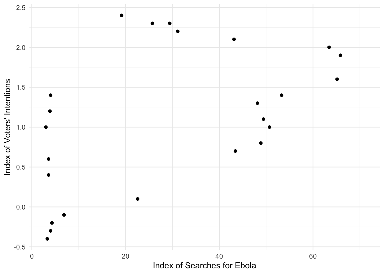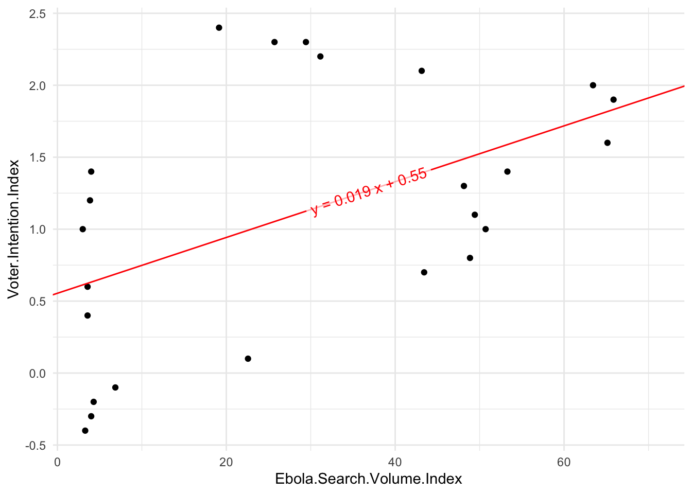 The regression model found a significant relationship between voter intention index and Ebola search index, \(R^2=.26,p<.05\). The Ebola search volume index had \(b=0.02,t(22)=2.75,p<.05\) in predicting voter intentions.