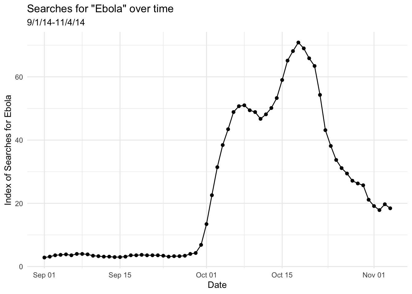 My conclusion: there were rare searches for the term “Ebola” for much of early September, 2014, and then a significant increase in early October of 2014, followed by a decline after the peak in mid-October. Why do you think this might have been? There’s a wikipedia article about the 2014 events; you can read it if you’re curious.