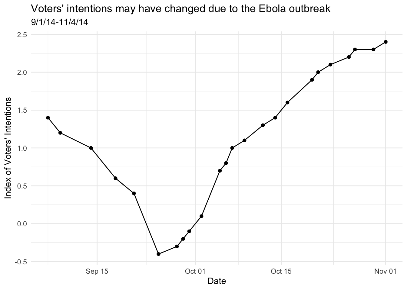You can use the above interface to look through the data. There are several variables and several NAs. You’ll get to look at some of the other variables later, but for the moment, we’re going to look at the Voter.Intention.Index and the Ebola.Search.Volume.Index—you can read the paper for more info, but these two have been created as indexes of the main ideas.