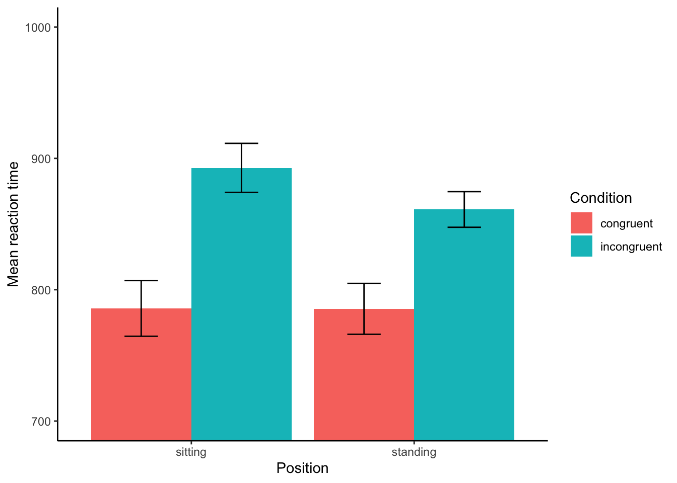 Is it clear here whether there’s a difference between conditions? We can change the y-axis to zoom in. You should be able to do the same thing in Excel or Sheets. I’m zooming to the RT between 700 and 1000ms. (I’ve also added the error bars.)