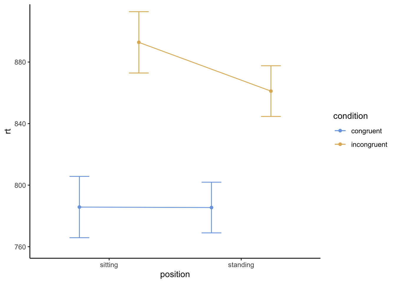 There’s no effect of position, though, \(F(1, 64)=0.75,p=.39\); participants didn’t respond more slowly when sitting or standing.