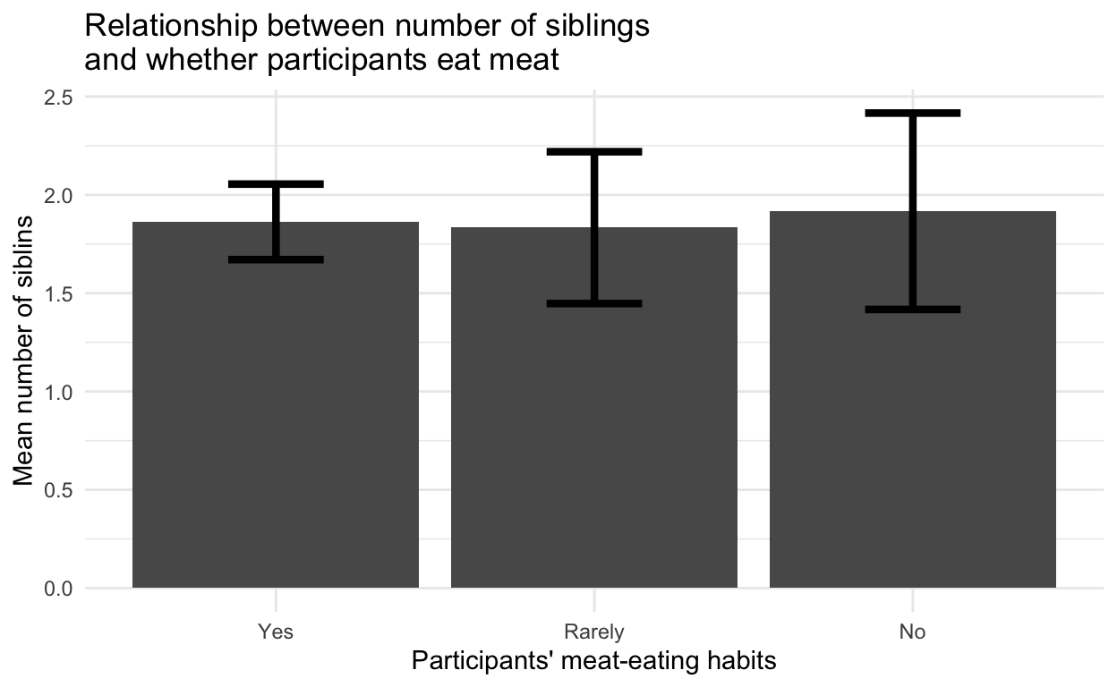 labs(x = "Participants' meat-eating habits", y = "Mean number of siblins",