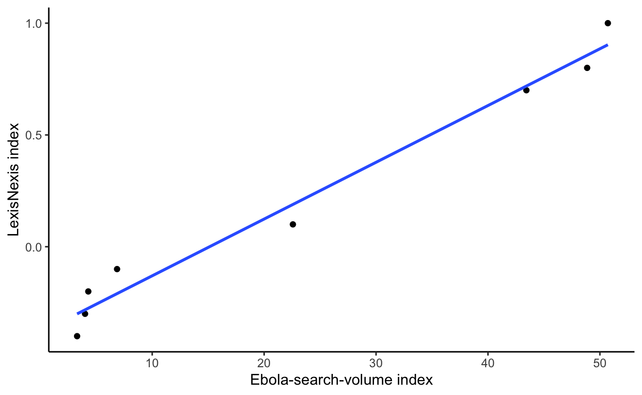 labs(x = "Ebola-search-volume index", y = "LexisNexis index")