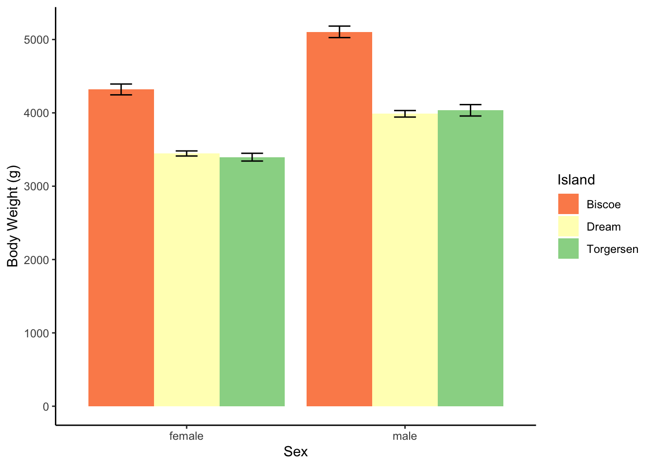 Get Jamovi to make you a plot as well. Which island has heavier penguins? Which sex is heavier?