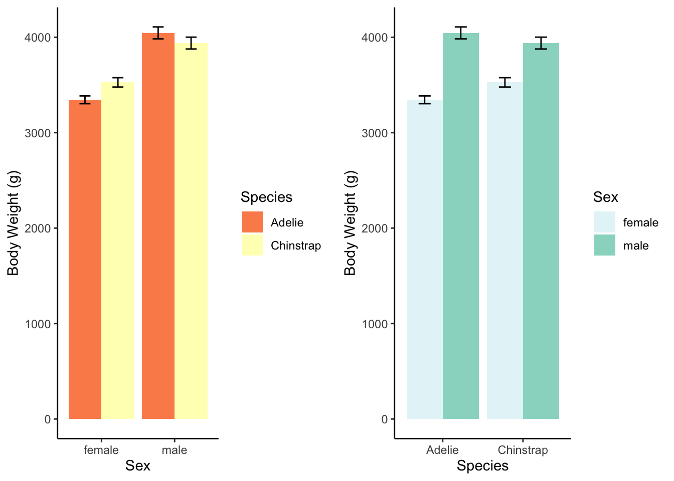 The interaction, explained: Adelie males are heavier than Chinstrap males, but Adelie females are not as heavy as Chinstrap females. But the species are roughly similar in weight.