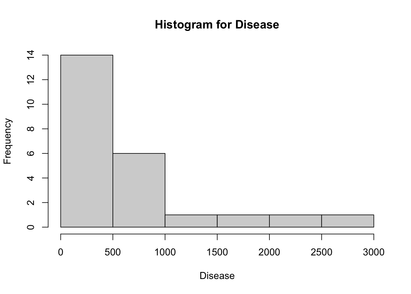 - Create a histogram using the full Disease data. Note that this histogram should only involve the disease data—a histogram shows frequencies of how often you get a certain response. Are these data normally distributed? How do you know? Answer these last two questions on your answer sheet, #1. Your plot should look something like this (although it might not have the title):